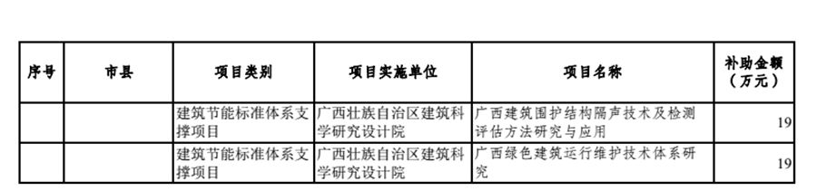 贵港市港南区可再生能源建筑应用示范项目补助金额150万元、平南县可再生能源建筑应用示范项目补助金额150万元;百色市靖西市可再生能源建筑应用示范项目补助金额150万元;河池市都安瑶族自治县可再生能源建筑应用示范县项目补助金额150万元;崇左市天等县可再生能源建筑应用示范县项目补助金额150万元。